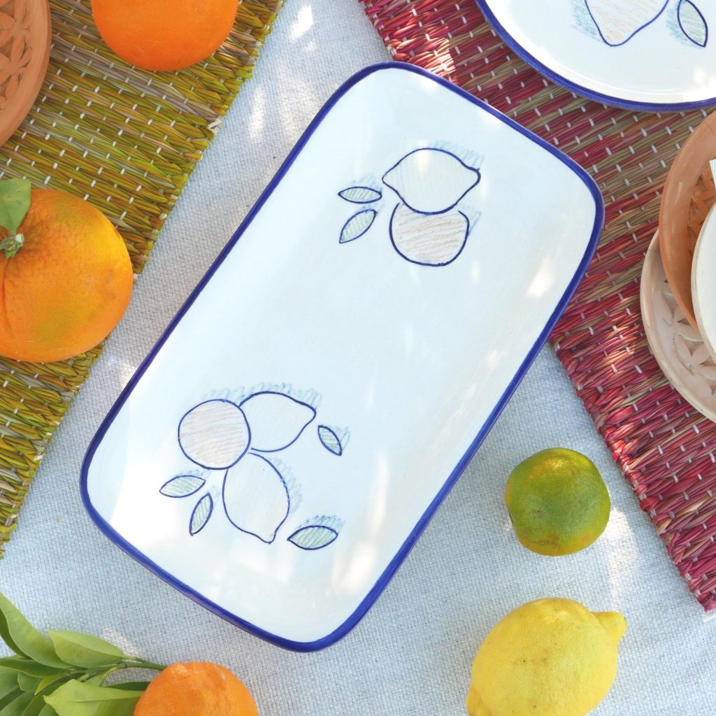 Ce plat à cake est inspiré de la Maiolica italienne, des céramiques aux tons vifs et aux motifs d’agrumes. Ici le décor est réalisé entièrement à la main, à l’aide de crayons. Chacun d’eux est donc une pièce unique. Un décor frais et moderne, des tons doux, une évocation de la Sicile qui vous feront voyager tout au long de l’année. Ce plat peut également être utilisé pour servir un café gourmand ou comme petit plateau. La gamme comprend également quatre assiettes à dessert et une large tasse.