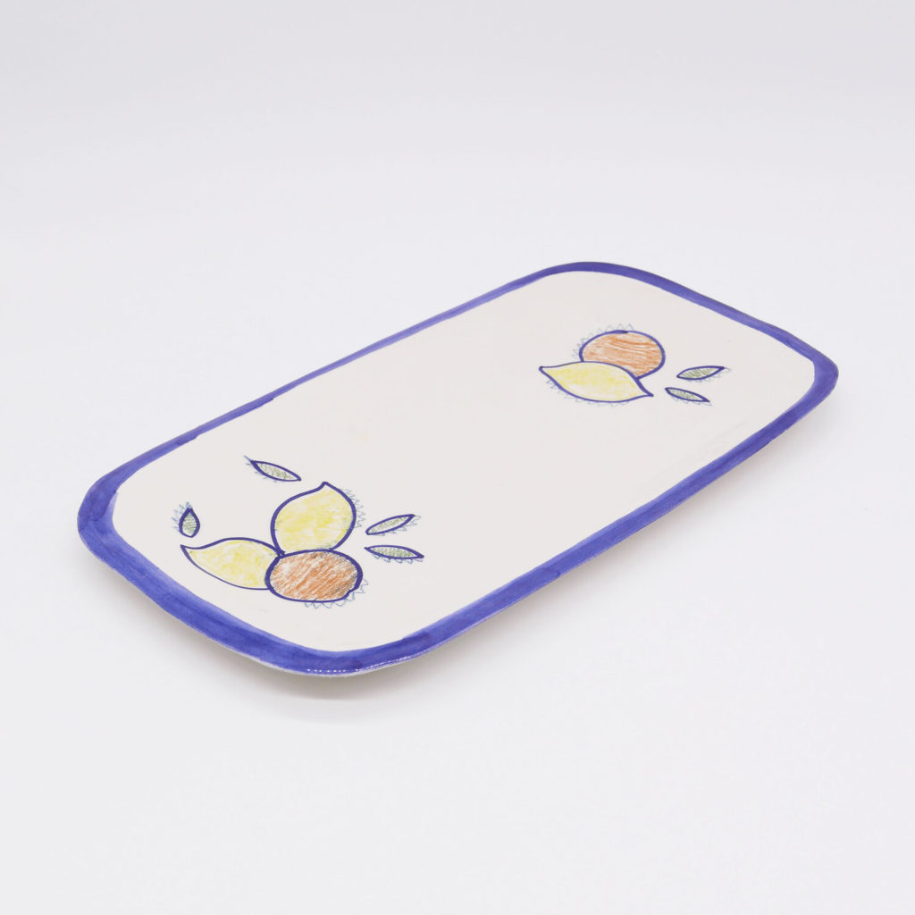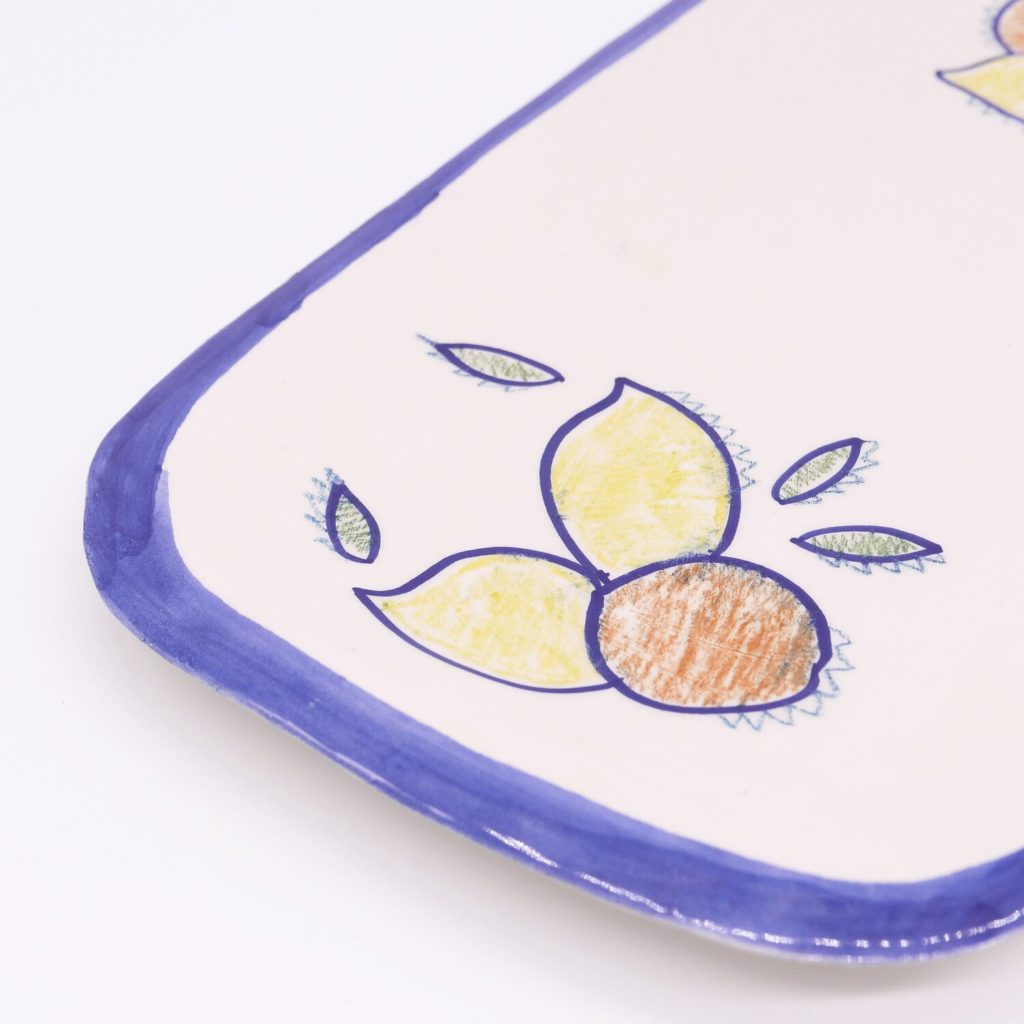 Plat à cake rectangulaire en terre blanche et motifs de citrons et oranges italiens crayonnés